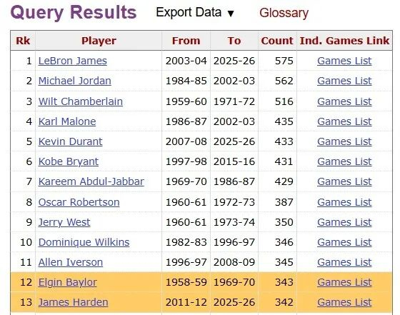 这也是老登常规赛生涯第343场30+,追平埃尔金·贝勒升至历史第12位。