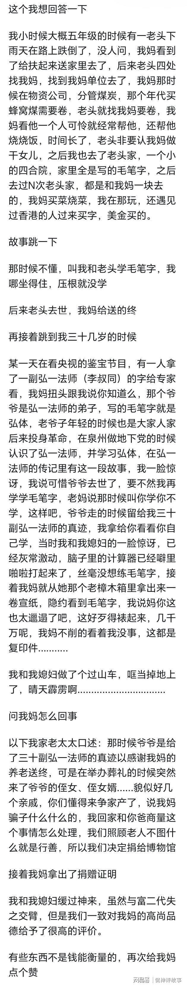 这些骗小孩的家长特别愚蠢,没有想过如果小孩真的因为以为家里没钱而跑去做些坏事,比如偷东西或委屈自己不吃饭什么的。弘一大和尚的墨宝?这位大和尚可是中兴佛门律宗的一代宗师啊。律宗持戒极其严苛,非是有大毅力大德行的高僧才能持戒。大部分人都是修持禅宗,以顿悟之名行放纵之实。弘一法师修行律宗,以大毅力持戒奉律。极为了不起。其实带入你的叔叔和姑姑们也是能理解的,曾经以为...