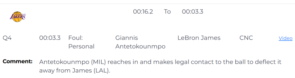 在昨天的NBA常规赛,湖人101-105不敌雄鹿,最后30秒,詹姆斯在一次突破中被字母哥盖帽。不过从照片上来看,旁边防守的特纳已经明显犯规。不过,已经出炉的NBA最后两分钟裁判报告对这一球解释为没有犯规。